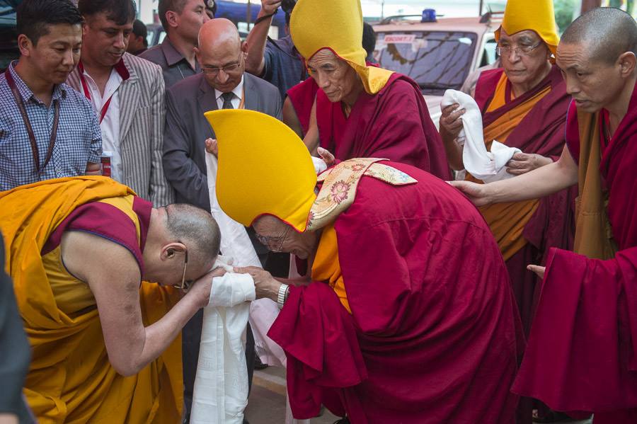 ![]() The Dalai Lama being greeted by the current 102nd Ganden Tripa, the Sharpa and Jangtse Chojes - successors of our Root Teacher, the 100th Ganden Trisur - the highest hierarchs of the Gelugpa lineage, last month, at Ganden Jangtse Monastery, India.
