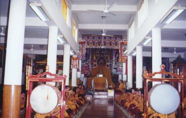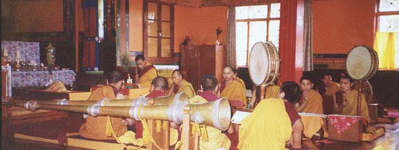 ![]() Jhado Rinpoche leading the elite monks of Namgyal Monastery in their daily prayers for peace and happiness of the world. |