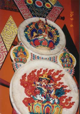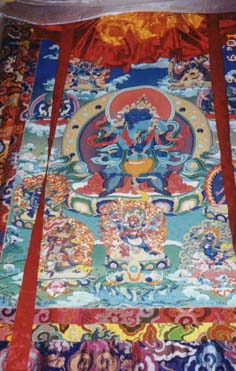 ![]() A most lovely painted scroll or "Thangka" depicting Vajradhara and Consort, the ultimate symbol of Buddhahoods inseparability of Method and Wisdom. |