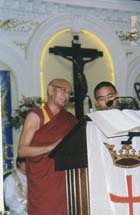 ![]() Khensur Rinpoche giving a short teaching in Novena Church to a few thousand Catholics during one of the Church's most important festivals. Geshe Thupten Tashi, a former teacher of Kopan, is translating for Rinpoche. [ June, 1998 ] |