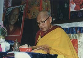 ![]() HH Ganden Tri Rinpoche in the Hall of Great Compassion of Siong Lim Temple, Singapore - His Holiness is teaching on Gampopa's Lam-rim text, "The Jewel Ornament of Liberation". This is a rare commentary from the Official Head of the Gelugpa Tradition on a traditionally Kagyu text. [ August, 2000 ] |