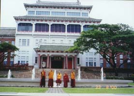 ![]() HH the Ganden Tri Rinpoche with His distinguished students taking a leisurely stroll in the Nanyang Technological University, Singapore, at the Chinese Culture Heritage Centre [ August, 2000 ] |