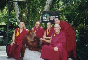 HH the Ganden Tri Rinpoche and His distinguished students with the star of Mandai Zoo, Ah-Meng's daughter, Ah-Bao. [ August, 2000 ] |
